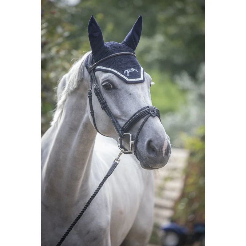 En coton crocheté, il est décoré d’un galon blanc sur le contour du chanfrein et la broderie du logo Pénélope est assortie pour plus d’élégance.