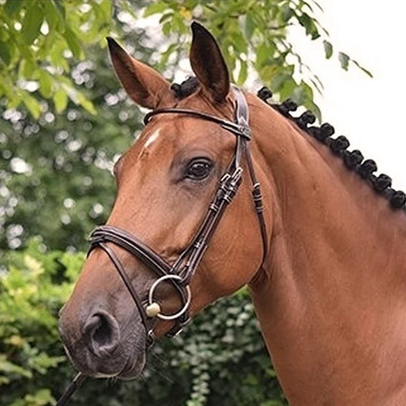 Il se prête à une utilisation en concours hippiques comme aux écuries. La muserolle combinée est légèrement bombée et surmontée d’un fancy en contraste crème. La têtière est assez large, la bouclerie est en inox et les rênes dans un caoutchouc très souple, très agréable pour monter à cheval.