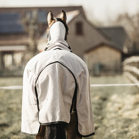 La couverture anti-mouches est fabriquée à partir d’un tissu à mailles dense et structuré, qui empêche la plupart des insectes d’entrer. La maille est extrêmement solide et sera un compagnon de terrain idéal pendant de nombreux étés. Le tissu est plat à l’intérieur, ce qui donne une sensation de douceur et garantit qu’aucun poil ne collera à la couverture. Grâce à la couleur claire de la couverture, elle réfléchit les rayons du soleil et n’absorbe pas la chaleur. La maille fine permet toujours la perméabilité à l’air. La zone de la crinière, du poitrail et de la queue est doublée d’un polyester lisse pour éviter les frottements.