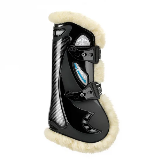 La guêtre Carbon Gel Vento est signée Marcus Ehning et garantit une double ventilation. La chaleur qui se dégage du membre du cheval traverse la couche en néoprène microperforé et se distribue ensuite dans le tissu 3D mesh ventilé. L’air frais entre dans la prise d’air, et dirige la chaleur vers le haut et la grille de sortie. La ventilation est donc à la fois horizontale et verticale. La protection des tendons aux antérieurs est garantie par le carbone associé à une couche en Nitrexgel absorbeur de chocs. Le revêtement intérieur en Techno Sheepskin, un matériau de fabrication totalement respectueux des animaux, offre un grand confort au cheval, allié à une esthétique unique en son genre.