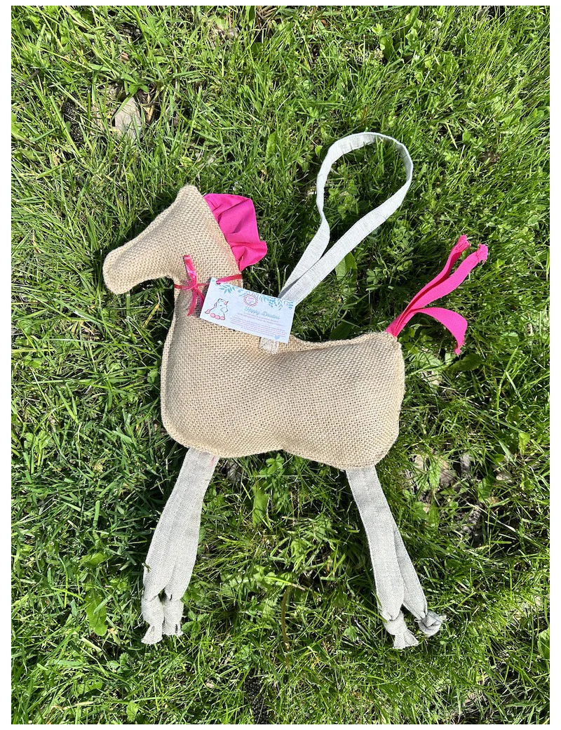 Mes pattes sont cousues intérieur et extérieur, je suis rembourré de chutes de jutes et de coton avec un peu de papier cristal pour amuser et accompagner longtemps votre cheval ou chien !