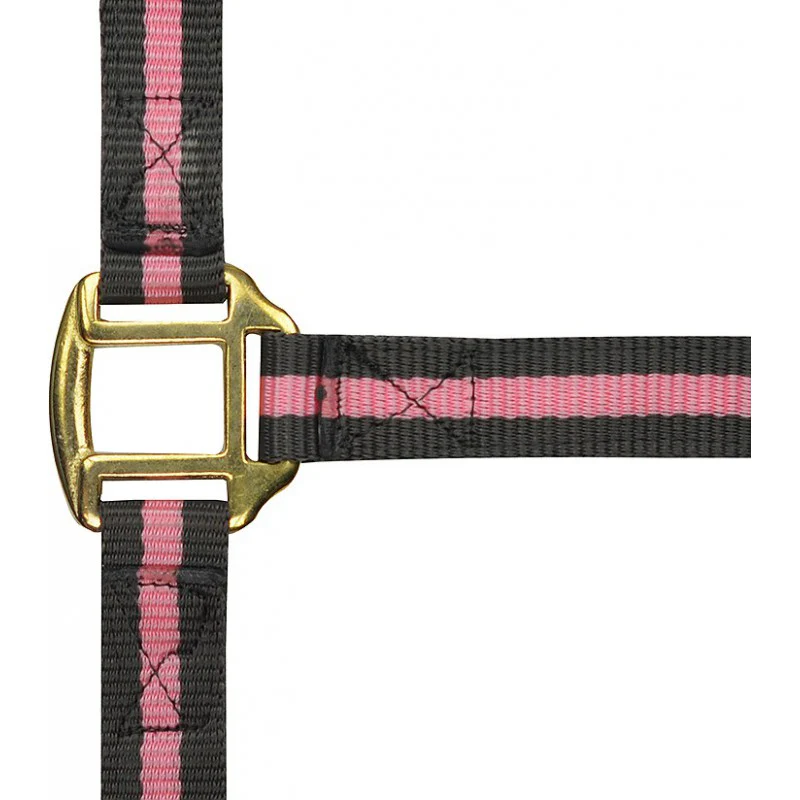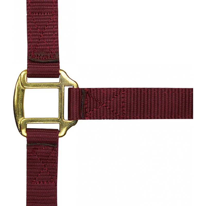 En nylon triple épaisseur avec muserolle et têtière réglables et doublées croûte de cuir de buffle noir. Bouclerie métal jaune.