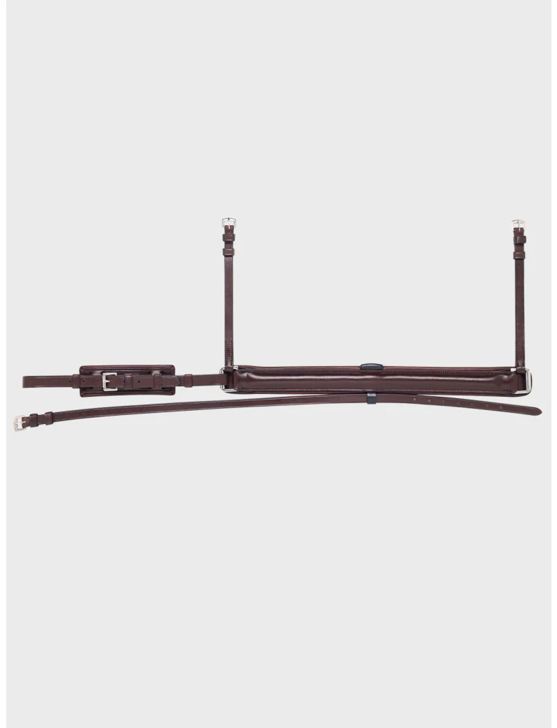 Muserolle suédoise avec doublure assortie et boucle en caoutchouc amovible pour le passage du noseband. Conçue avec une surface plus large qui permet de réduire la pression exercée sur les terminaisons nerveuses sensibles. Légèrement rembourrée pour plus de confort. Disponible en noir et en marron, tailles cob et cheval.