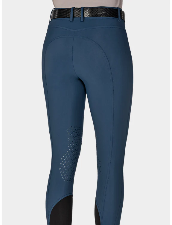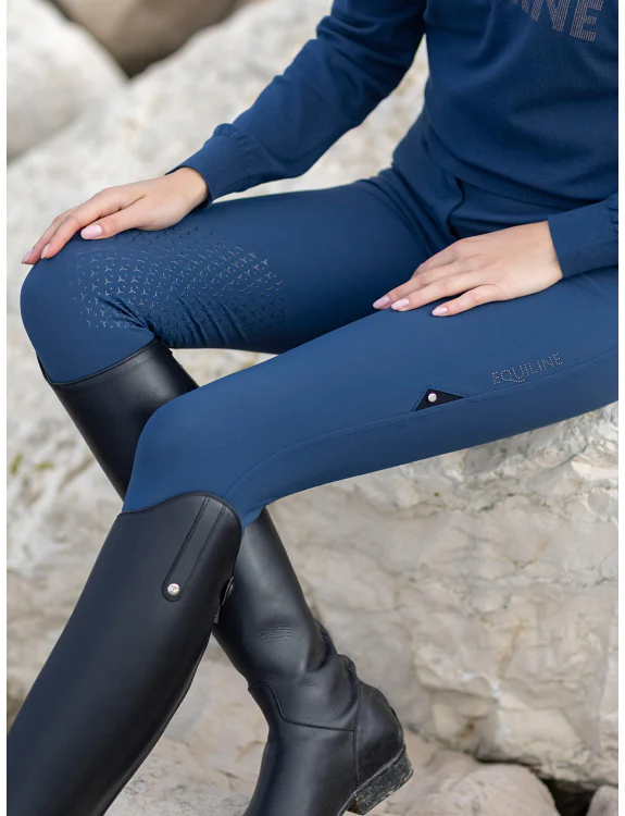Culotte d’équitation Diplomatic Blue pour femmes avec basanes aux genoux et taille haute. Tout nouveau tissu B-MOVE non tissé (protection solaire UPF 50+) léger, extensible, respirant et extrêmement confortable. Inscription Equiline en micro-boutons sur la jambe et détails en micro-boutons sur les poches, tous deux en ton sur ton gris mat.