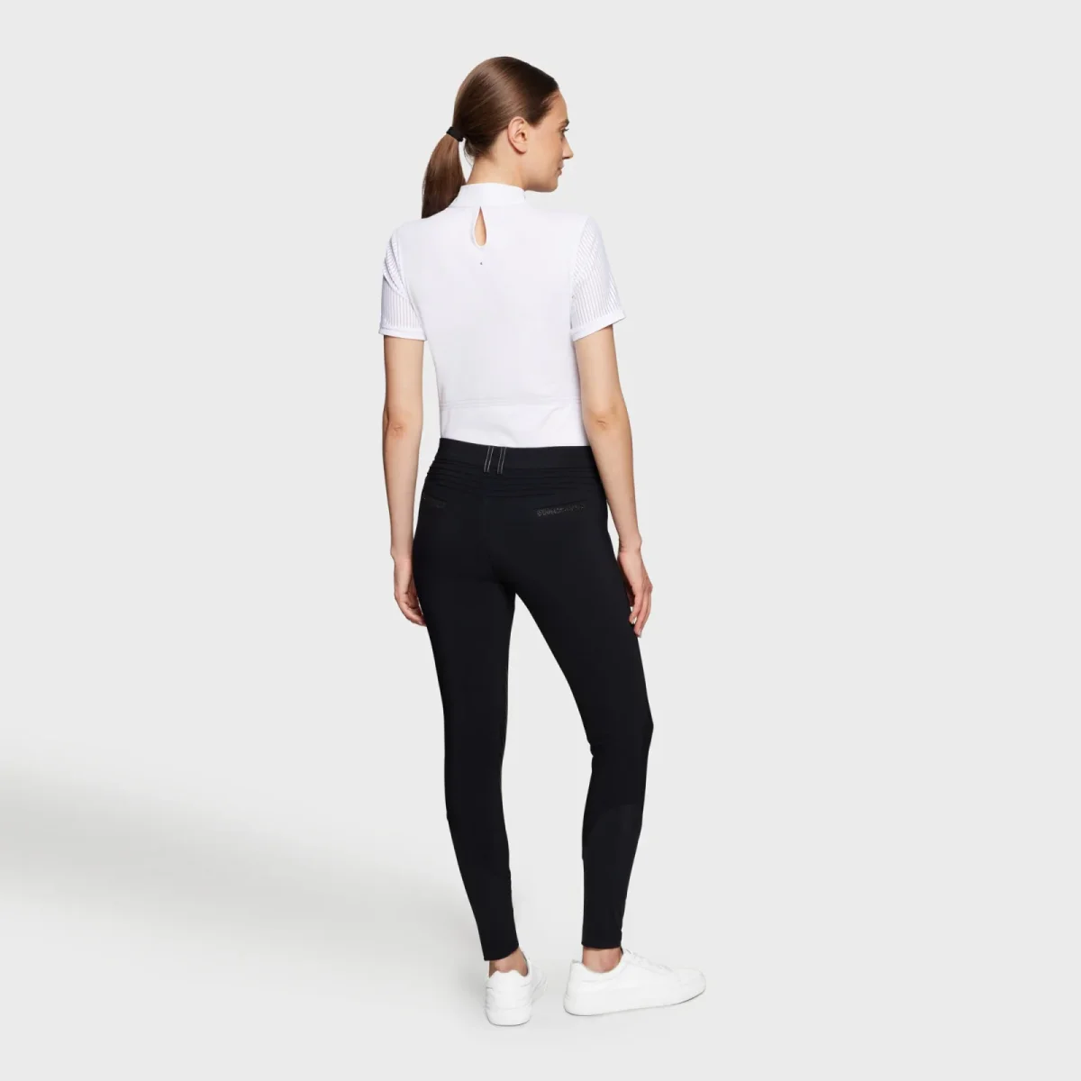 - Style pratique et élégant avec poches à zip sur le devant, doubles poches à l’arrière et logo Samshield en cristaux sur la cuisse