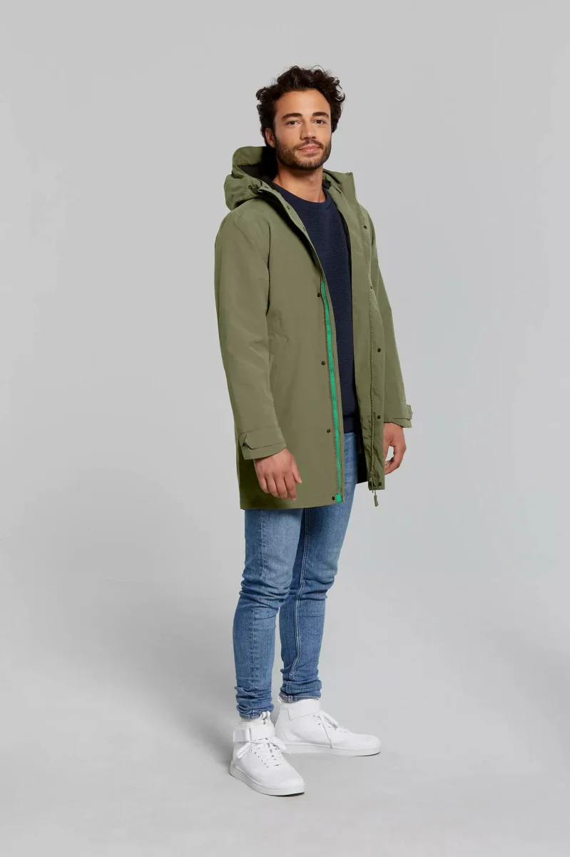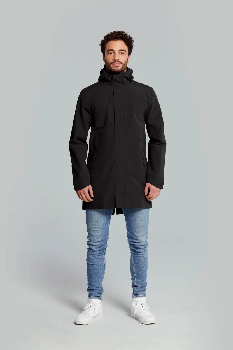Soyez stylé et prêt pour la pluie avec le parka de pluie pour vélo pour hommes Basil Mosse. Ce parka noir est non seulement très tendance grâce à sa coupe fishtail, son tissu mat et sa couleur à la mode, mais il vous protège également de la pluie. Le tissu T-Fabric 5.000 WP et 5.000 MVP rend la veste imperméable et respirante. Le revêtement DWR assure que l’eau de pluie ne s’accumule pas sur la veste et que l’intérieur reste sec (la transpiration est évacuée). Grâce à la coupe longue (fishtail), même vos cuisses restent au sec. La fermeture éclair double sens vous permet de rouler confortablement. Le parka dispose également d’une doublure en mesh/taffetas, de poches latérales pratiques et d’aérations à l’arrière et sur les avant-bras. Les manches sont allongées et ajustables pour un ajustement confortable. La capuche en trois parties est ajustable, vous offrant une excellente visibilité tout en faisant du vélo.