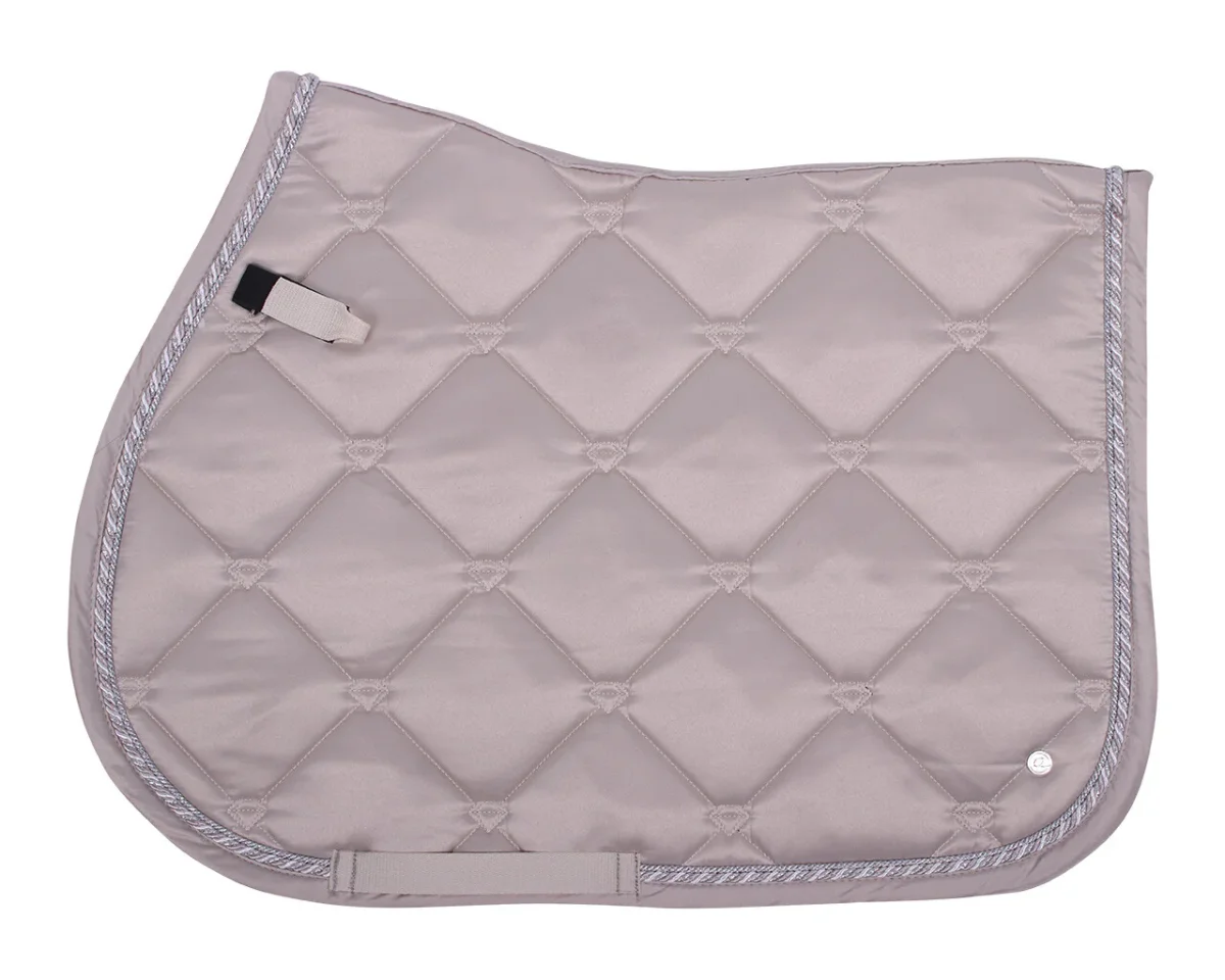 Tapis de selle élégant avec matelassure en diamant et deux cordons décoratifs pour la touche chic supplémentaire. Le tapis de selle comporte des passants de sangle et des passants de selle courts qui permettent au tapis de selle de rester bien en place. L’épingle « Q » sur le côté gauche complète le tapis de selle.