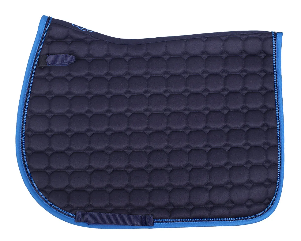 Élégant tapis de selle de forme anatomique avec deux cordons décoratifs et une bordure colorée. Le tapis de selle est équipé de boucles de sangle qui assurent le maintien du tapis. La broderie QHP complète le tapis.