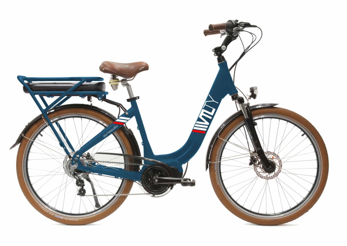 Cadre couleur bleu, selle et poignées marrons, pneus marrons. Roues 26″ ou 28″